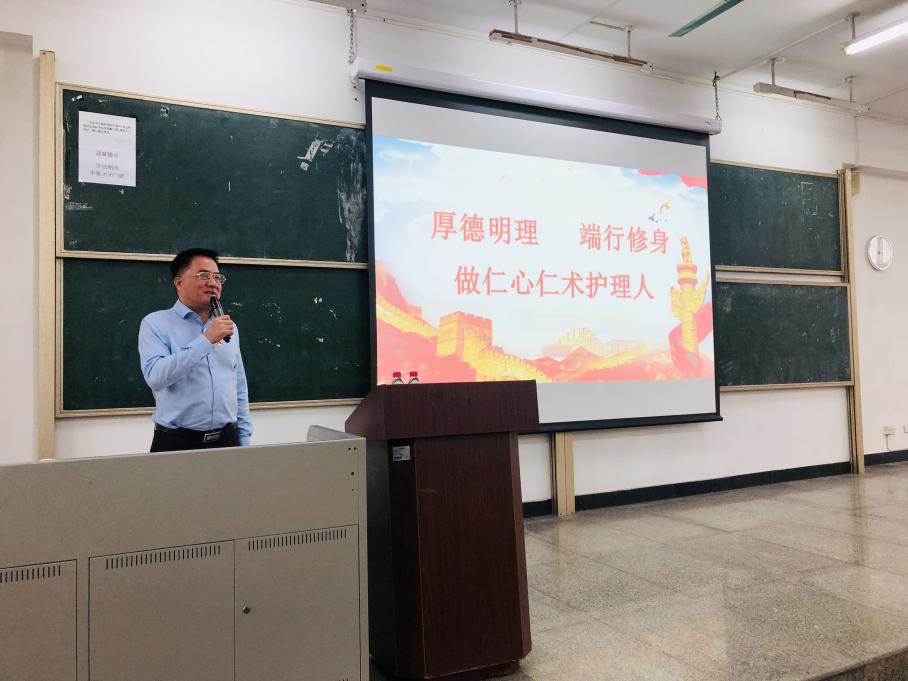黄健清副校长在实习动员会上专门给2019级护理学专业学生上了一堂生动的思政课,他从“加强道德教育,树立正确价值观”、“规范临床实习,践行德艺双标准”、“学习先锋人物,争当有为新青年”三个方面阐述了如何做到厚德明理、端行修身,做仁心仁术护理人,勉励同学们以钟南山院士、南丁格尔和护理前辈们为榜样,坚守医者救死扶伤的初心,用真诚、热情、奉献的精神来诠释护理工作的圣洁和伟大。