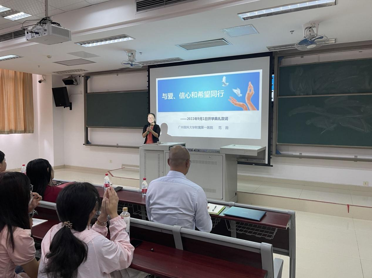 接下来,2022级新生代表王奕斐同学发言。她表示,在疫情面前了解到护理专业的使命及担当,毅然决然选择了广医护理专业。她希望大家在未来四年学习生涯中要保持乐观开朗、富于创新,更要砥砺品格、博学笃志、发奋图强,不辜负钟南山院士对我们的殷切期望。