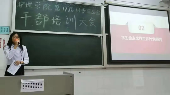 接着学生会主席陆子琳作学生会主席工作总结报告,并对20级新干事们作工作计划任务布置,呼吁干事们做好带头作用,努力调动同学们参与活动的激情,提高学生们的兴趣与活力。