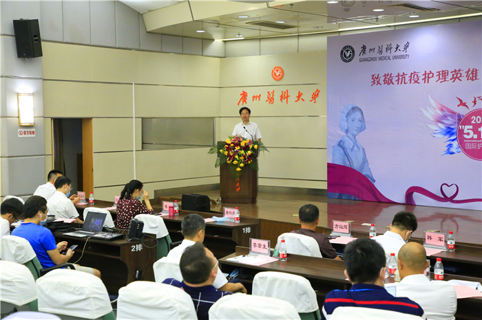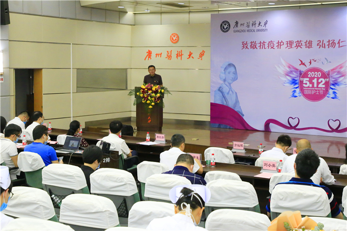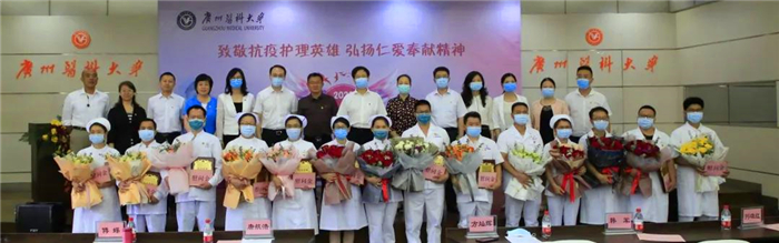 2020年5月12日,第109个国际护士节,今年国际护士节的主题为“守护世界健康”。当日上午,学校举办“致敬抗疫护理英雄 弘扬仁爱奉献精神”主题庆祝与致敬活动。广州市人大常委会副主任、市总工会主席唐航浩,团市委副书记高洪祥,广州市妇联副主席傅蝶,广州市教育工会负责人韩军等领导,学校副校长、工会主席方灿辉和相关职能部门负责人,各附属医院相关负责人,广医系统全体援鄂护理人员,风驰直播