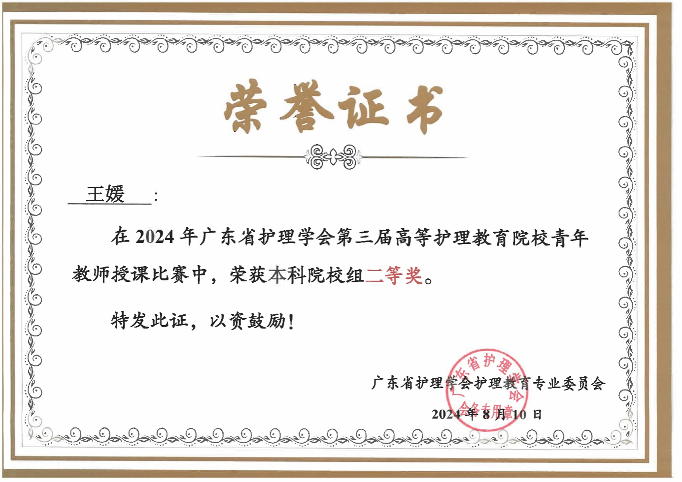 此前,王媛老师在广东省第三届高等护理教育院校青年教师授课比赛中荣获本科组二等奖(排序第1),获得代表广东赛区参加全国比赛的资格。2024年9月19日至23日,由中华护理学会主办、福建省护理学会承办的第三届全国高等护理教育院校青年教师授课竞赛在福建厦门举行。