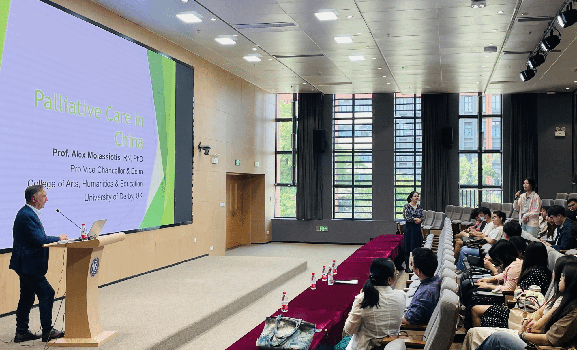 Alex Molassiotis教授首先介绍了姑息治疗在我国的发展历程和现状,再以肿瘤患者姑息治疗实例为例,深刻而生动地向同学们展示了姑息治疗对改善终末期肿瘤患者生活质量的价值和意义,同时分析了影响我国姑息治疗发展的障碍因素,并结合WHO姑息治疗模型,从完善课程设置、加强医护人员培训、改变大众的传统观念等方面提出了推动我国姑息治疗的针对性建议。