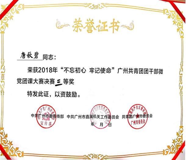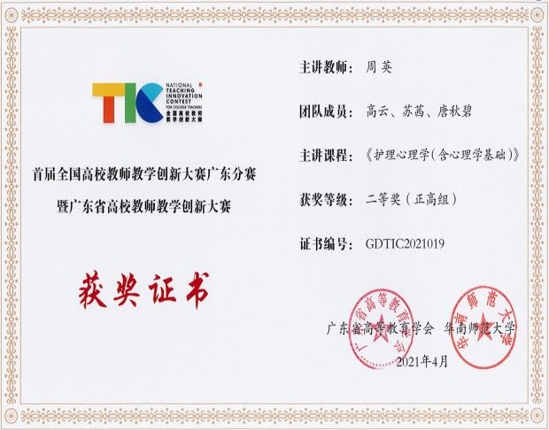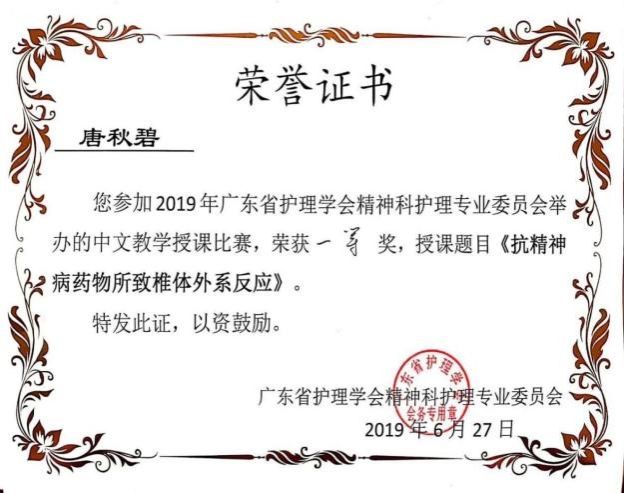 教学培训方面,唐秋碧担任我校护理硕士研究生的临床导师,承担护理学研究生、本科生的部分教学工作,是国家级一流课程《护理心理学(含心理学基础)》教师团队成员。尤其在正念疗法方面,唐秋碧创立了广州医科大学附属脑科医院“正念认知疗法培训与实践基地”,在临床率先为精神障碍患者开展正念疗法,同时每年均对省内外的同行进行正念疗法的相关培训,从2016年至今共培训学员将近两千人次。曾代表广州市卫健委参加广州“不忘初心,牢记使命”微党团课比赛荣获三等奖,参加首届全国高校教师教学创新大赛广东分赛暨广东省高校教师教学创新大赛获二等奖,参加广东省护理学会精神科护理专业委员会中文教学授课大赛获一等奖等。