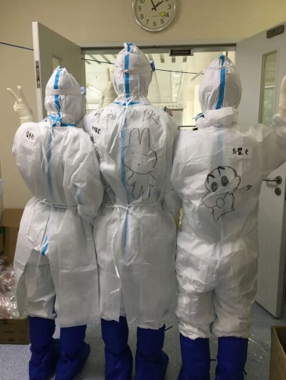 为了缓解我们上班的压力,这几天上班前几个心灵手巧的“战友”总会在我们的防护服上画上点画、写上点东西,互相鼓励!前天上班前就通知说要收病人,于是就有了这图“精神小伙,新收找我”,哈哈,真是谢谢战友们对我的厚爱和器重啊,把新收患者这种重任交给我!