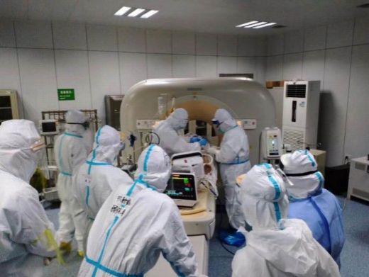 转运路途中,因为年前施工的原因导致近路很坎坷,我们不得不绕大马路。而此时,协和西院的曲护长早已经和安保准备好,为我们临时设置了一条隔离区,暂停了人员的出入。路途中,需要经过多处的坑坑洼洼以及减速带,每一次,都必须把ECMO设备抬起地面,尽可能地避免颠簸。就这样,短短的几百米的路,我们不知道把设备抬起来放下去了多少遍。遇上小坡的时候,因为穿着鞋套,脚上使劲打滑,完全用不上劲,推着车床和设备实在是太困难了。而此时,正中午的太阳把穿着厚厚防护服的我们像在火炉里面烤着,汗水早已经浸透了我们的衣服。不知道过了多久,经过了多少的路程,我们终于到了CT室。再次过床,再次评估管道的长度后,陈伯终于可以做CT了。不料,在做CT的时候陈伯血压突然往下断崖式下跌,老顾教授和席医生立马当机立断开始抢救,快速地下医嘱,我和黄护长刘川老师赶紧执行医嘱,这时候,幸亏当时打多了一条外周静脉通道,这真是一条生命通道啊。我当时利用这条通道快速地输血,尽快地补充患者的血容量。